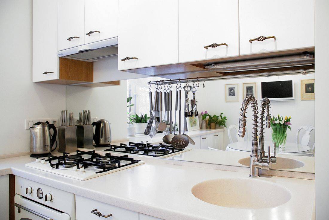 На кухне наличие зеркал допустимо только в двух местах: там, где отражается обеденный стол, и около плиты