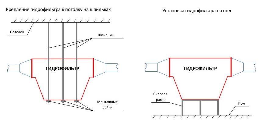 Установка гидрофильтра всегда производится по горизонтали. Его можно размещать на поверхности стены, под потолком либо на полу последнего этажа. При установке используют специальные кронштейны. Последние следует укрепить на потолок. К их нижним концам укрепляются рейки в горизонтальном положении, а на них ставится гидрофильтр.