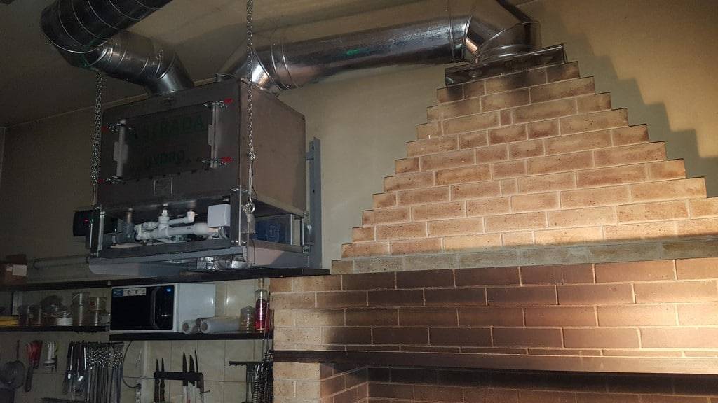 Мангал в помещении всегда дополняется системой отвода дыма. Она состоит из дымового колпака и дымохода. Также часто составной частью этой системы является гидрофильтр. Его всегда можно увидеть в барах, кафе и ресторанах.