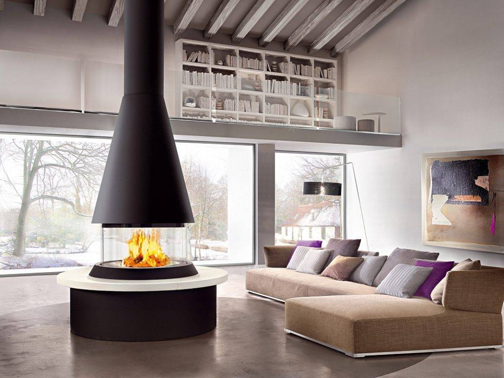 Поверх площадки обязательно нужен улавливатель дыма, коммутирующийся с дымоходом. В целом вся конструкция обладает приличными габаритами, поэтому применить ее в небольших или средних по площади помещениях не получиться. В любом случае, перед установкой необходимо проконсультироваться со специалистами. Также можно встретить островные камины подвесного типа: они крепятся к потолку, и как-бы парят над полом. Чаще всего им сообщается соответствующий скандинавскому стилю дизайн.