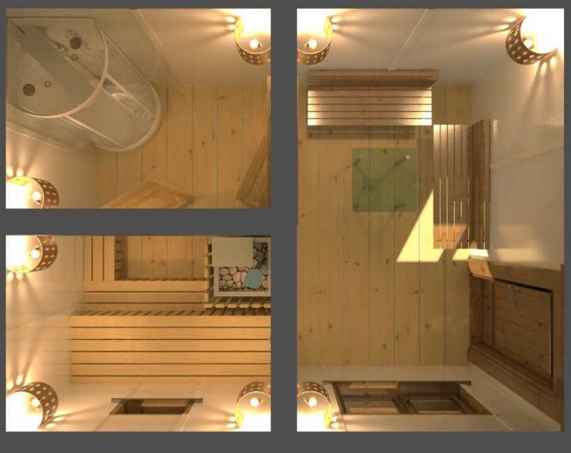 При неправильном проектировании конструкции, будет утеряна значительная площадь помещения. Комната может быть скругленной, ровной или иметь вид сот. Для осветительных приборов в парилке устанавливается понижающий трансформатор.