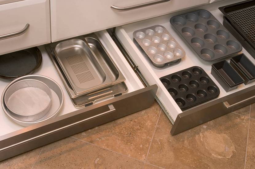 Цокольные ящики. Для тех, кто ценит порядок в кухонных шкафах, идея устройства ящика в цоколе гарнитура покажется как минимум, заманчивой. Ящик заменяет декоративную планку и подходит для хранения плоских предметов: больших блюд, кондитерских форм, противней.