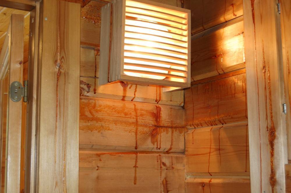 Высокая смолистость сосны не позволяет ее использовать в помещениях с высоким температурами. При нагревании, поверхность сосновой вагонки начинает обильно выделять смолы, которые проявляются как подтеки. Такие выделения крайне трудно и трудоемко очищаются. Растопленные смолы, при высоких температурах создают чрезмерно концентрированный воздух, что особенно негативно может сказаться в герметизированном помещении сауны. Настолько насыщенный воздух может навредить здоровью, а не оказать оздоровительный эффект бани. Однако же для отделки стен банных помещений для отдыха между процедурами, сосновая вагонка очень хорошее решение.