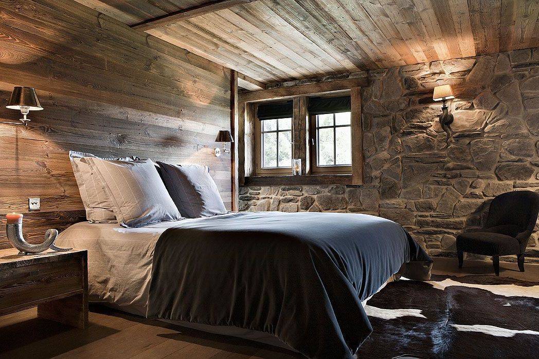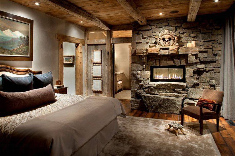 Такой интерьер предполагает применение определенных материалов для декорирования стен, мебели, полов, потолочных поверхностей. При расположении спальной комнаты на мансарде либо под кровлей, нет необходимости дополнительно закрывать балки, вполне достаточно лишь покрыть их слоем прозрачного защитного лака. Дизайн отличается применением натуральных и естественных материалов, поэтому в интерьер прекрасно вписывается стена, оформленная фактурной штукатуркой, и натуральный камень. Дополнительно можно включить в интерьер и камин, выполненный из камня или керамических изразцов.
