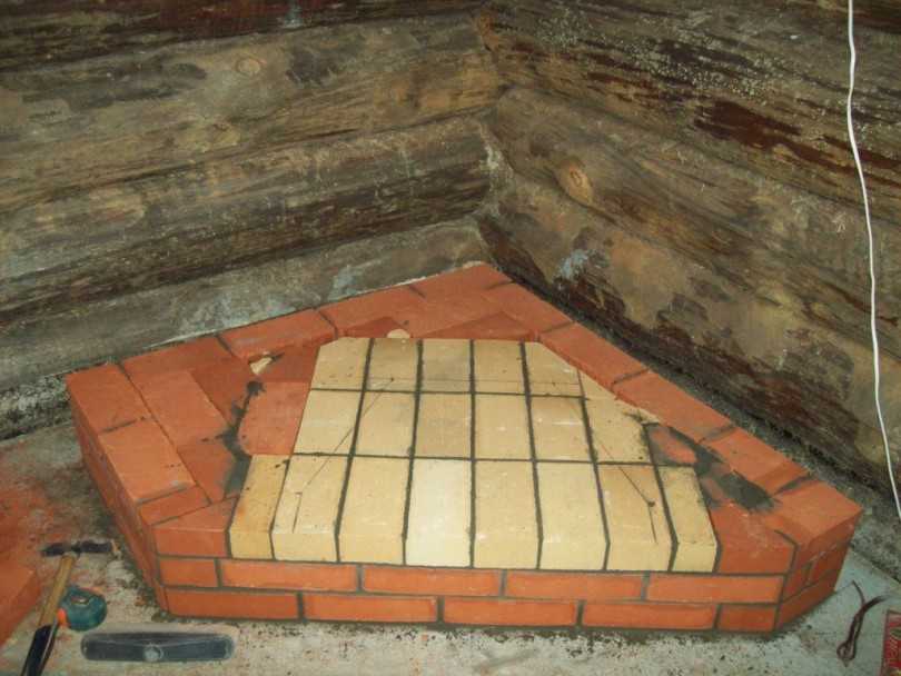 - Выполняется кирпичная кладка подиума, который необходим для защиты основания от высоких температур при сжигании дров.