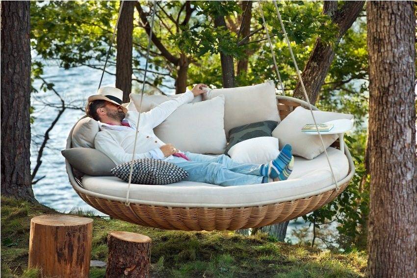 Оригинальные садовые качели круглой формы с мягким матрацем