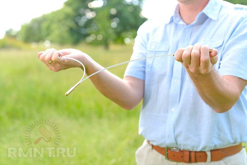 - развернув концы проволок в разные стороны и взяв трубки в руки, начинаем движение по участку;