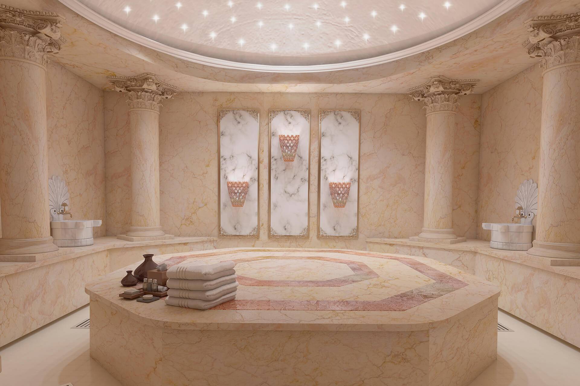 При наличии большого бюджета можно организовать водопады из стен и вместо смесителей использовать ракушки.