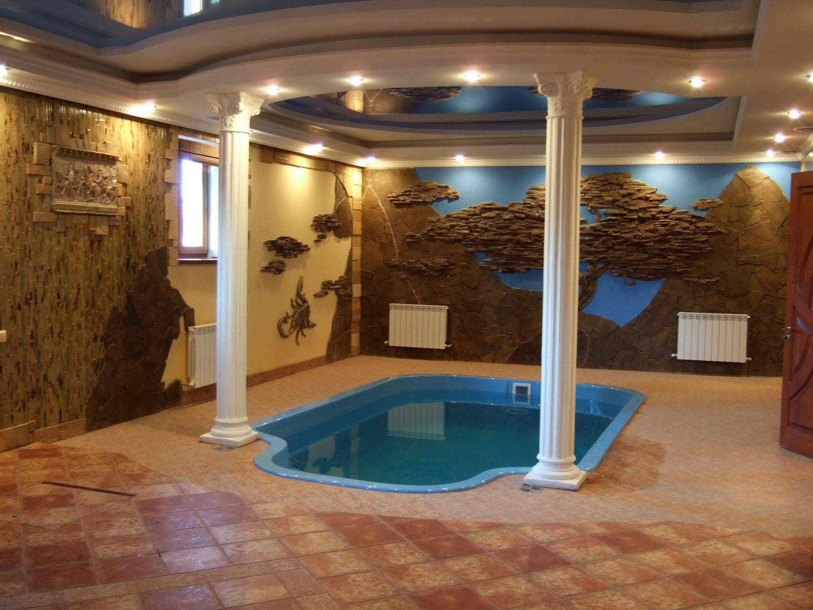 Участки пола, которые могут соприкасаться с большим количеством воды, рекомендовано отделывать плиткой с трапом. Что касается потолка, здесь подойдет лиственница и подвесные потолки – кассетные либо реечные. Время от времени потолки придется вымывать, а значит, материал должен спокойно реагировать на моющие средства.