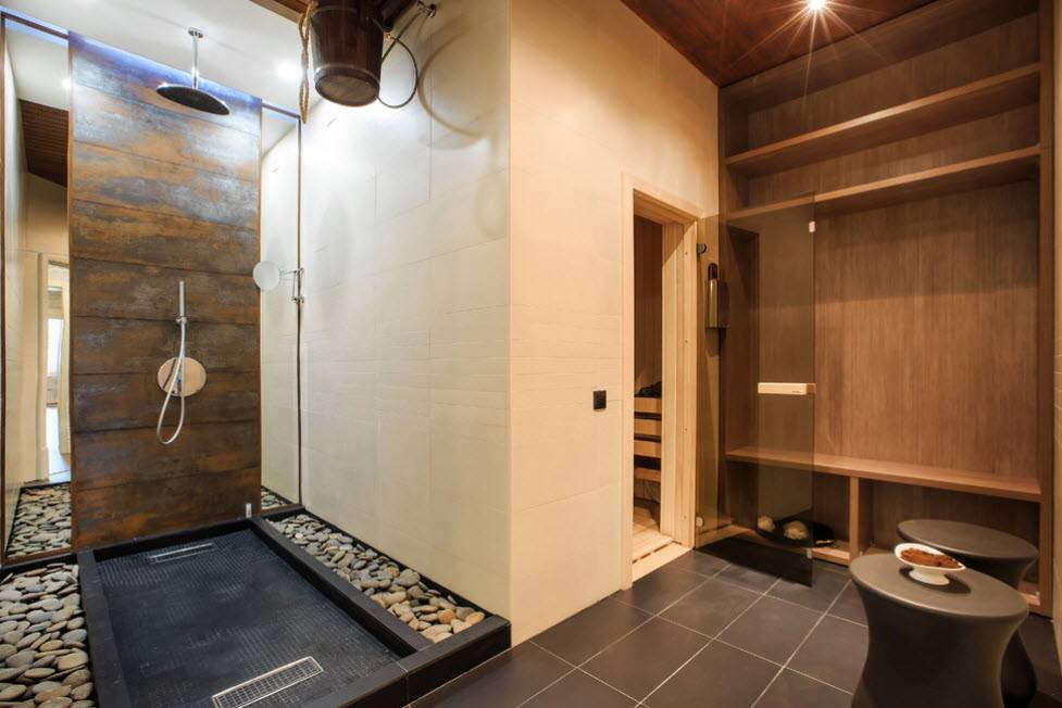 Душевая – это новшество, присущее современной бане, демонстрируют, как можно уединиться от чужих глаз. Облицовывать комнату предпочтительнее плиткой, добавляя в дизайн красочные элементы, такие как мозаика и витражное стекло. Особое требование к покрытию пола, оно должно иметь грубую фактуру.