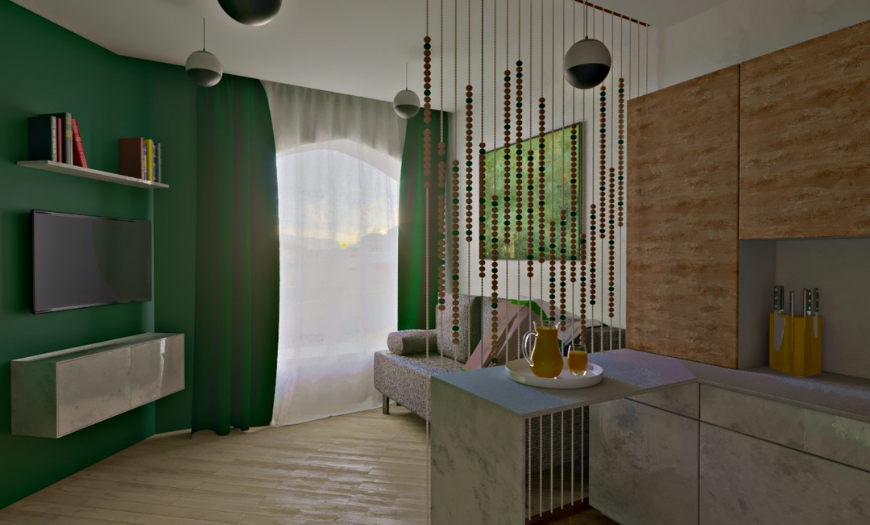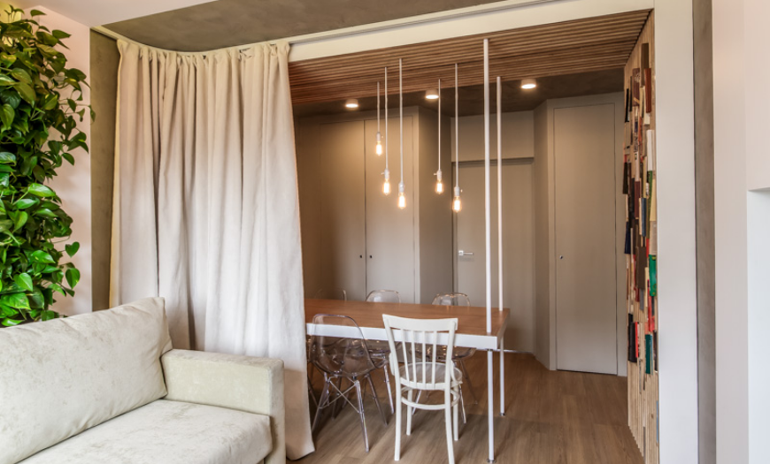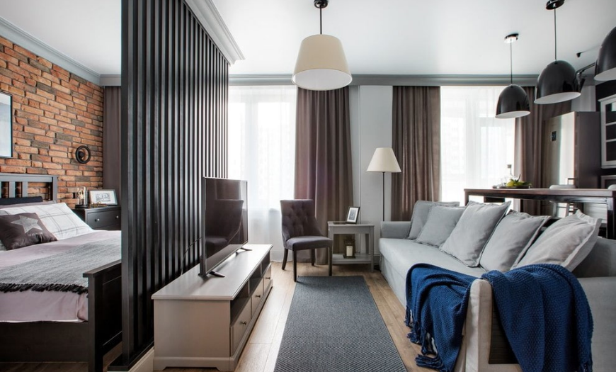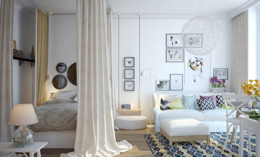 Не хотите использовать перегородки в однокомнатной квартире для зонирования, но в то же время нуждаетесь в физическом разделении территории? Повесьте шторы! Главное преимущество зонирования шторами в однокомнатной в том, что при необходимости они задвигаются и раздвигаются — а значит не внесут серьезных изменений во внешний вид квартиры.