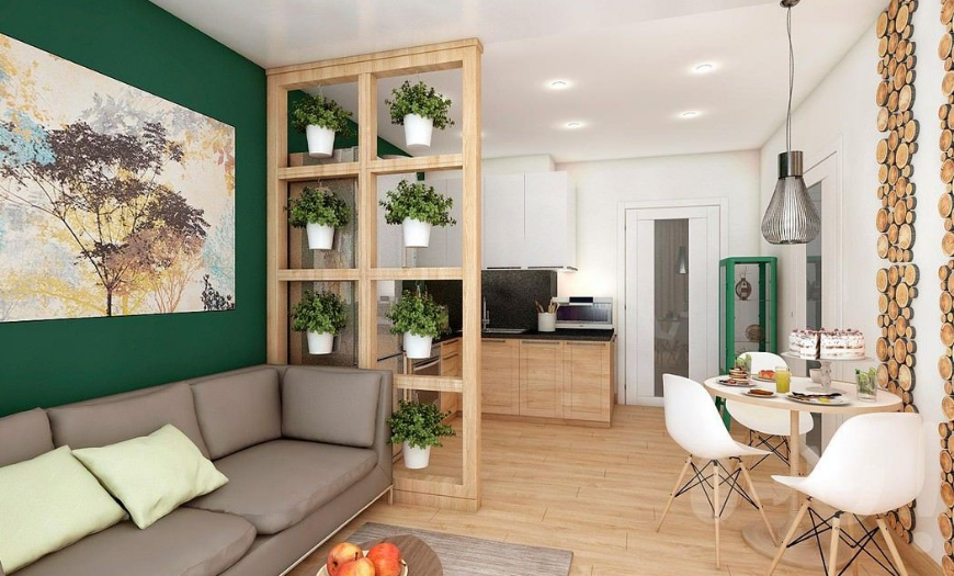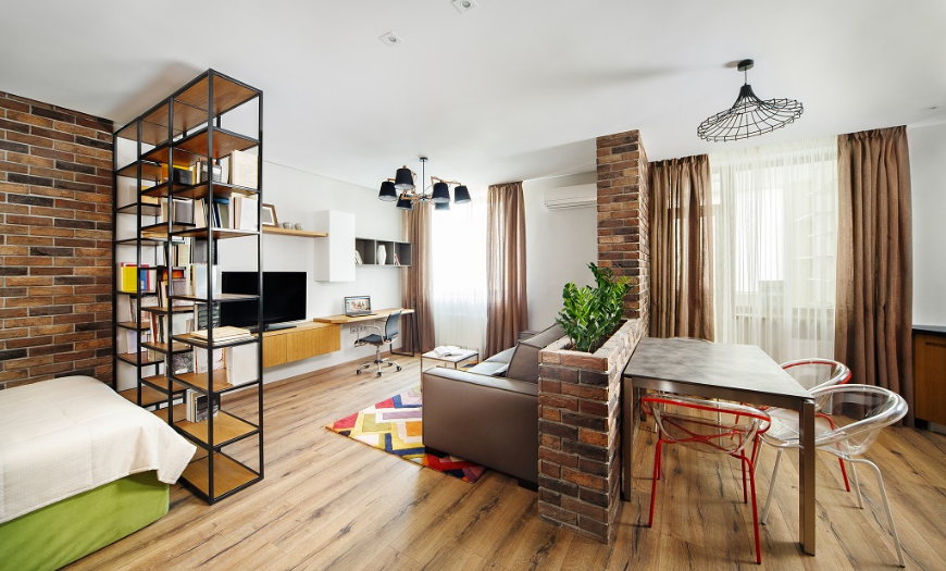 Тем кто предпочитает функциональный дизайн и не любит бессмысленных украшений, понравится идея разделения квартиры мебелью. Обычно применяют сетчатые стеллажи — они одновременно отделяют участки, при этом сохраняя способность проникновения солнечного света.