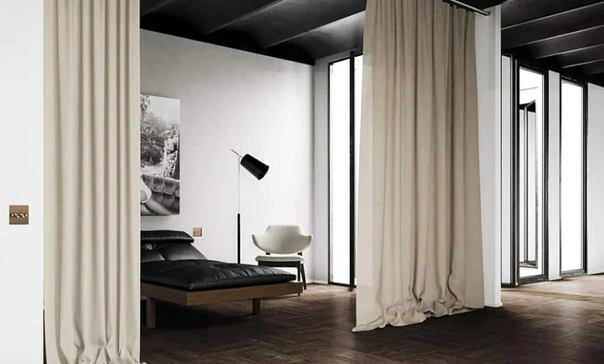 Чтобы зонировать помещение, можно выбрать ткани и оборудовать перегородки в виде: