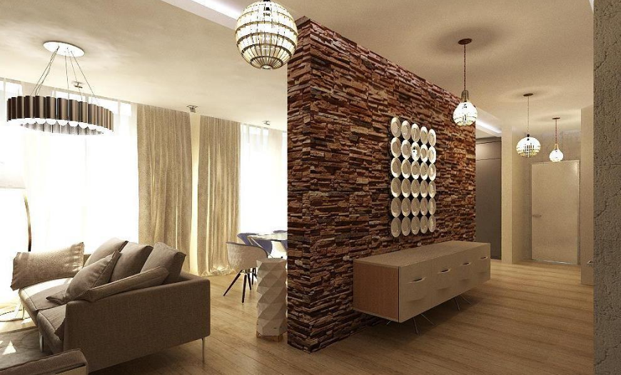 Каменные стены больше подходят интерьерам, оформленным в замковом стиле. Они часто применяются для разграничения зон в барокко, минимализме, лофте, хай-теке. В основе стационарных перегородок — кирпич, гипсолит, бетон, газосиликат. Для отделки поверхности подходят обои, керамическая плитка, краска, клинкер и другие материалы. Каменные перегородки в стиле лофт уместны и без дополнительного декорирования.