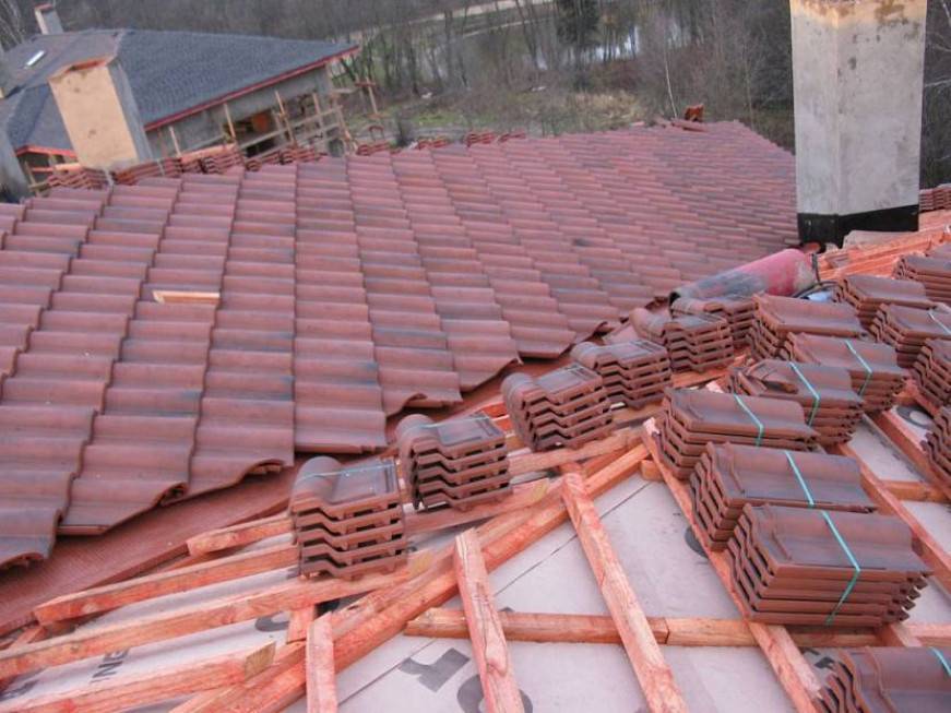 Учитывая немалый вес материала и вдобавок атмосферные нагрузки, в частности, снеговую нагрузку, стропильная система подобной крыши должна быть усилена. Стропила обычно изготавливают из досок, имеющих ширину 150–200 мм и минимальную толщину в 50 мм. Укладывают их с наименьшим шагом в один метр.