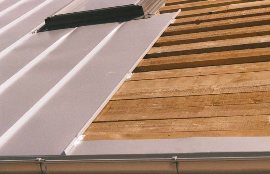Для фальцевого покрытия важным этапом является расчет шага. Превышение допустимого значения приведет к появлению прогибов покрытия; крыша приобретет волнистый вид, что нехорошо как с эстетической, так и с функциональной точки зрения. Для установки обрешетки выбирают доску 3,2×10 см или брус 5х5 см, их монтируют с шагом от 20 до 40 см. По линиям пересечения скатов и по краю устраивается сплошная обрешетка.