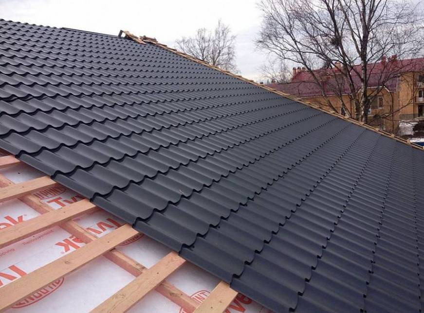 Конструкция для крыши из металлочерепицы изготавливается и монтируется по тем же правилам, что и для шифера. Отличаются только размеры: сечение брусьев составляет 5-6 см. На выбор расстояния между брусьями влияет их толщина и угол наклона крыши, обычно он не выходит за рамки 30-40 см. Шаг между двумя последними элементами уменьшают в два раза.