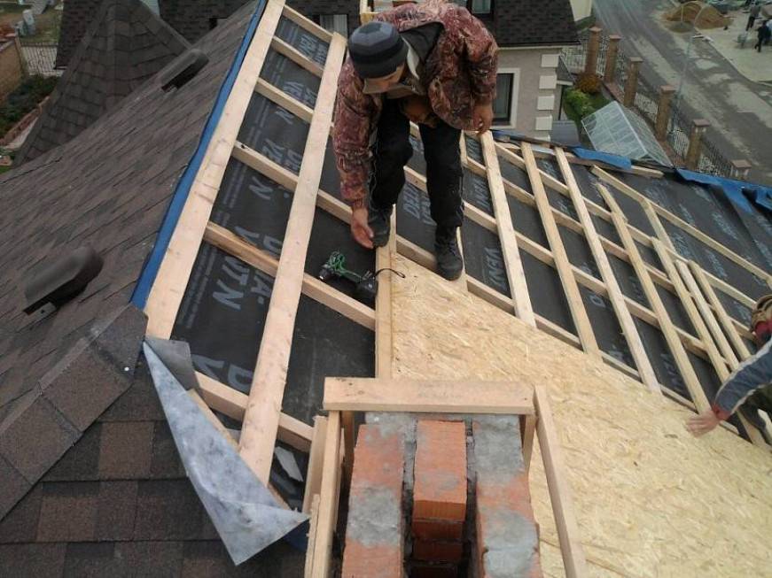 На определенных участках: низ кровли и район конька, доски обрешетки монтируют вплотную на ширину 30 см. Тем не менее при этом нужно оставить маленькие щели, чтобы сплошное покрытие со временем не деформировалось.