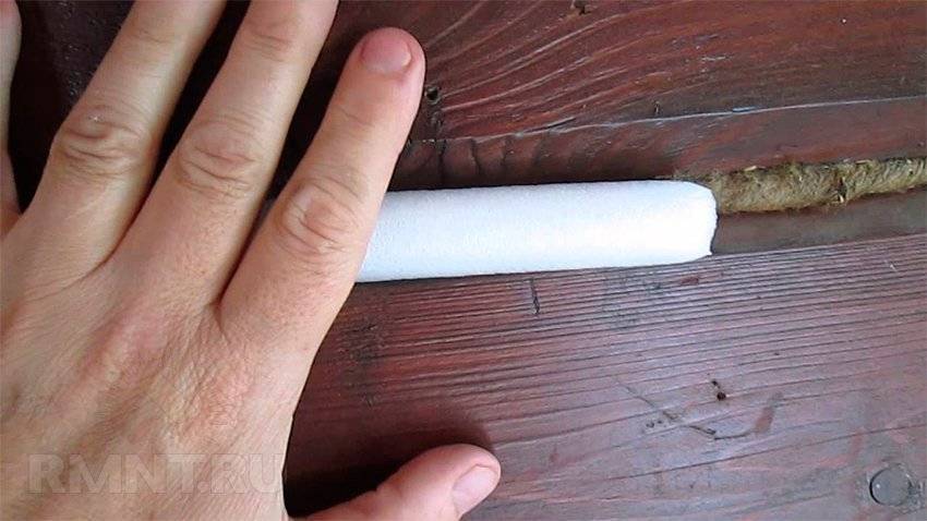 - «В набор» – щели конопатят ленточным утеплителем шириной 5-7 мм, края ленты поочередно забивают в щель, затем утапливают срединную часть.