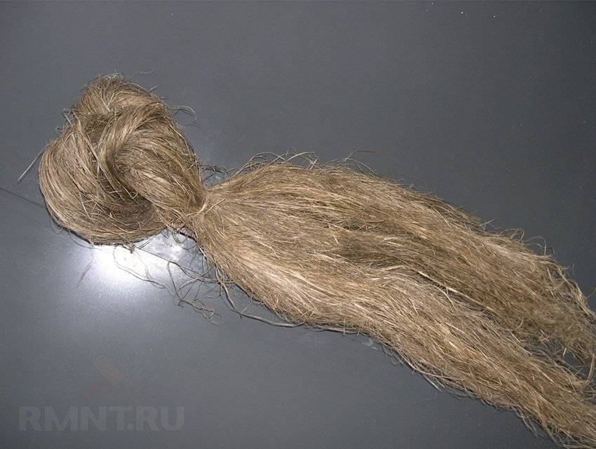 Выглядит примерно как пакля, но волокна гораздо грубее. Пенька такого рода содержит лигнин, что делает ее схожей по составу с древесиной.