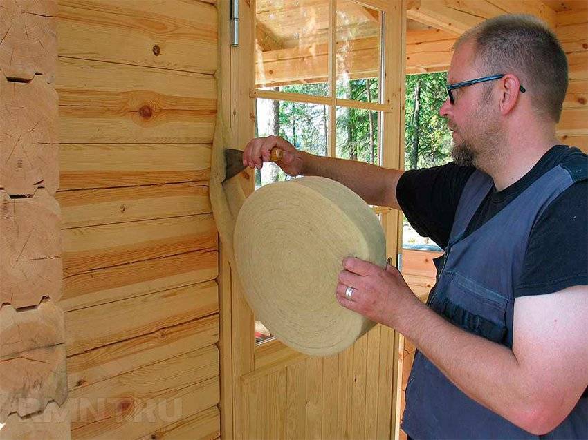 При внутреннем утеплении теплоизоляция межвенцовых зазоров может сочетаться с организацией утепления по принципу вентилируемого каркаса. В таком случае после первого и повторного уплотнений межвенцовых швов на поверхность сруба набивается деревянная обрешетка, шаг которой должен быть на 1-2 см меньше ширины утеплителя.
