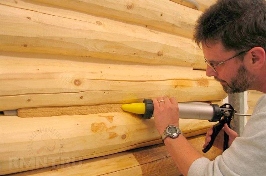 Если же использовать герметик с паклей, то все должно происходить по такой схеме: баня конопатится паклей два раза, и после полной ее усадке швы герметизируются. А для того, чтобы сэкономить герметик, в пазы желательно заложить шнур из утеплителя.