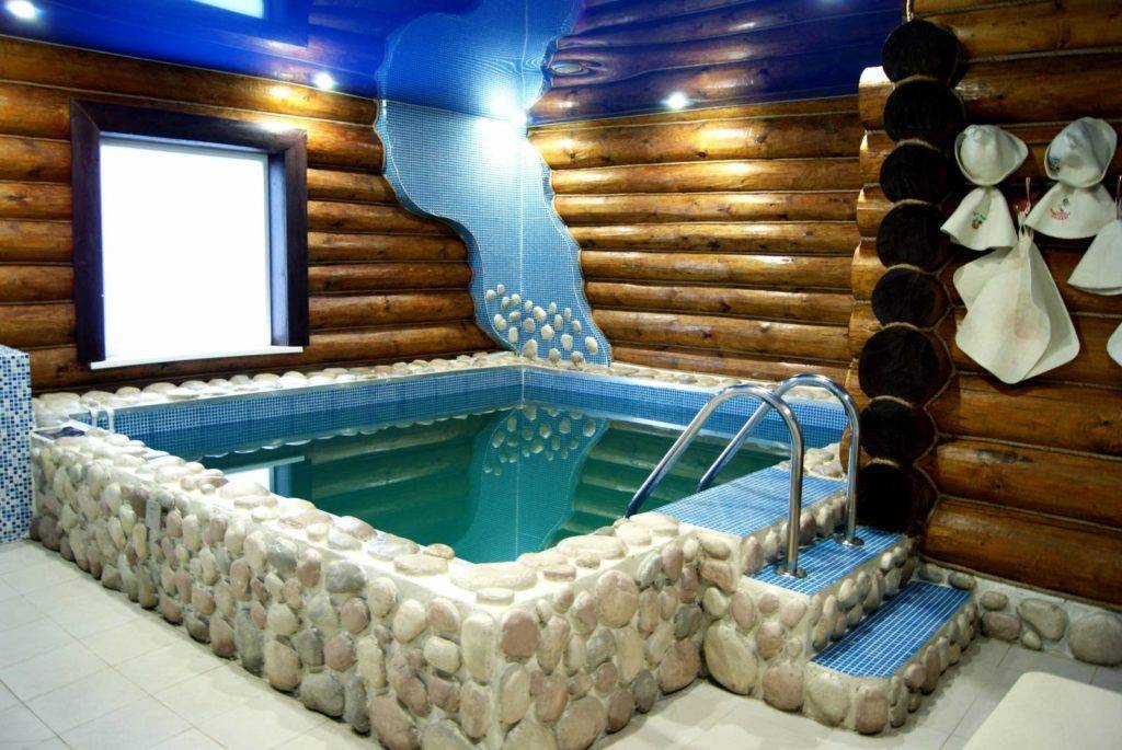 Если баня будет небольшой, то и бассейн рекомендуем сделать маленьким угловым, чтобы можно было просто ополоснуться после парилки. А если проект предполагает огромную баню большой площади, то можно установить большой водоём, где можно будет свободно поплавать.