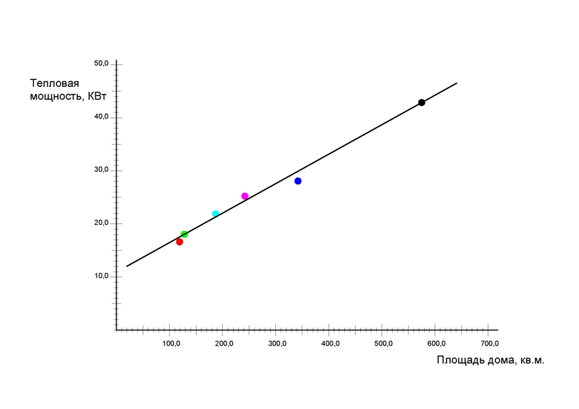 Эти данные основаны не на теоретических расчетах, а на статистическом анализе теплопотерь в реально существующих постройках, поэтому их применение на практике вполне оправдано. Как видно из графика, максимальное значение удельной мощности отопительной системы – 127 Вт/кв. м – соответствует самой малой величине отапливаемой площади – 100 – 150 кв. м. Для более просторных домов, площадь которых составляет от 400 до 500 кв. м, величина удельной отопительной мощности падает до 80 – 85 Вт/кв. м.