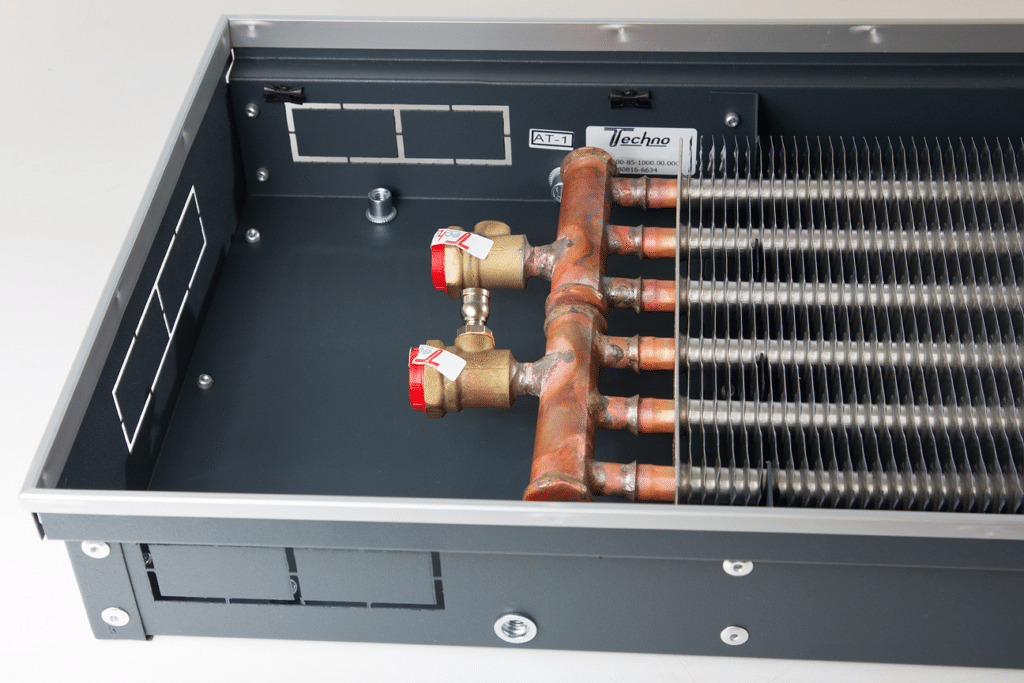 Водяные конвекторы в качестве нагревательного элемента используют трубчатый оребренный теплообменник, по которому движется теплоноситель, отдавая тепло нагреваемому воздуху. Теплообменник выполняется чаще всего из меди, нейтральной к влиянию внешних негативных факторов – коррозии, низкому качеству теплоносителя и так далее. За счет оребрения увеличивается площадь теплообмена.