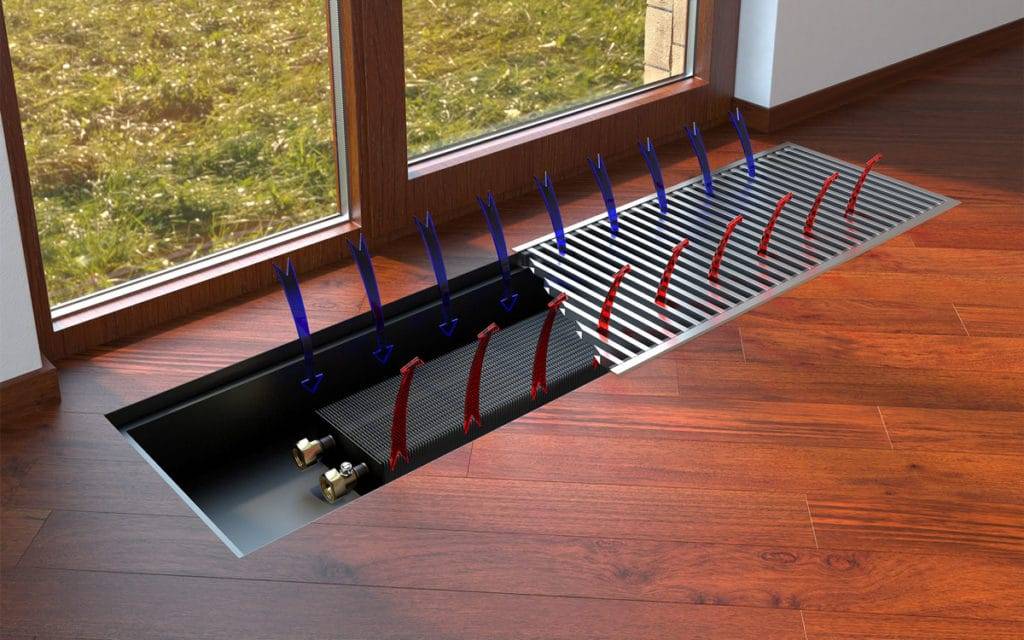 Воздух проникает внутрь кожуха через специальные отверстия, нагревается и покидает конвектор через защитную решетку. Некоторые типы конвекторов для повышения тепловой мощности оснащают встроенными вентиляторами, увеличивающими поток подачи воздуха. Такие конвекторы по эффективности работы превосходят радиаторы.