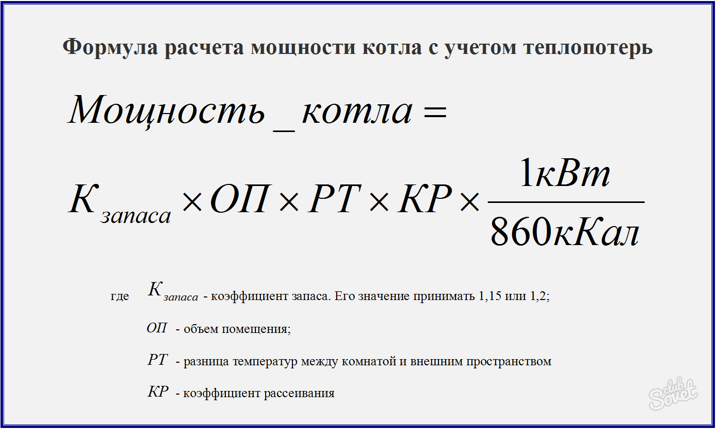 В расчетах используется формула: P = V*K*T/860, где обозначены: