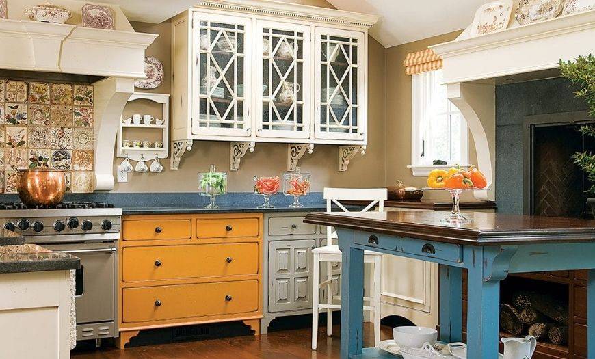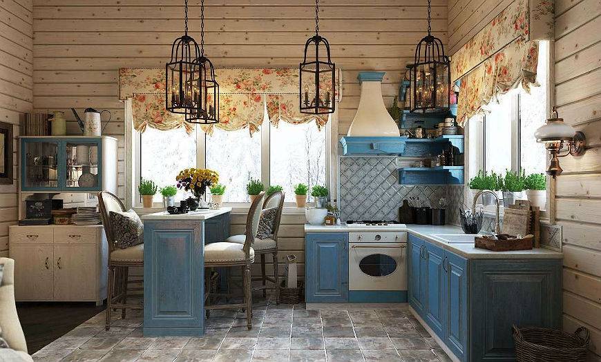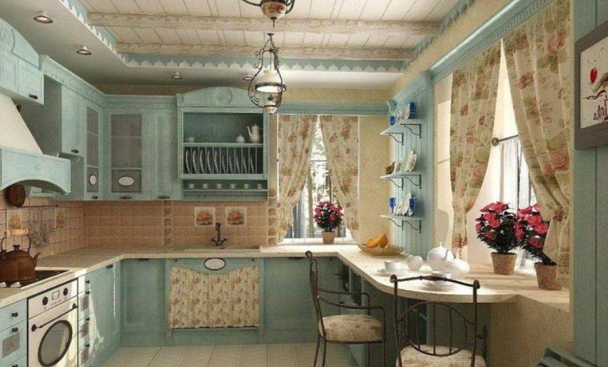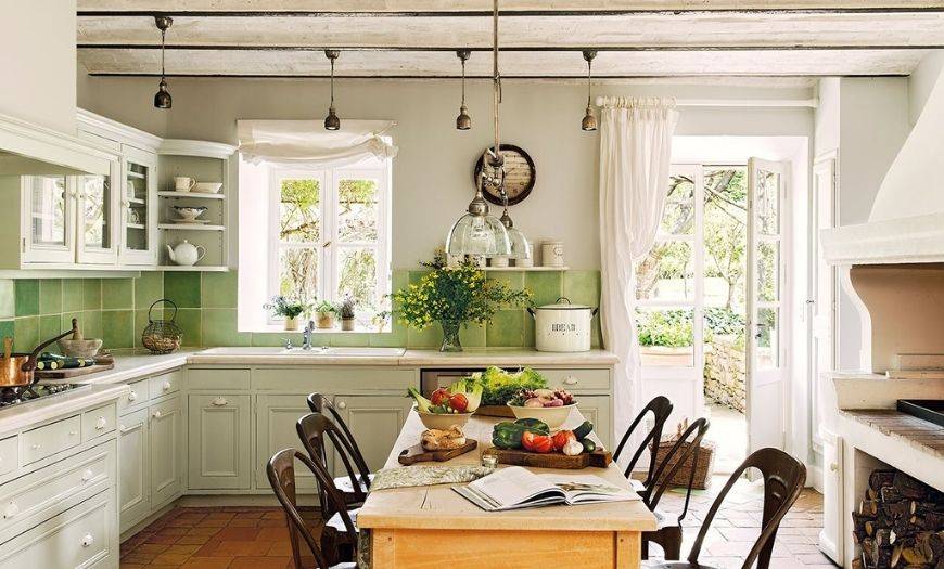Отреставрированный бабушкин сервант с открытыми полками заполняется сервизом или вазонами с цветами, красивые занавески в деревенском духе размещаются на окнах, старой скатерти с цветочным узором найдется место на столе. Стены выкрашивают в светлые тона, пол можно оформить деревом или камнем.
