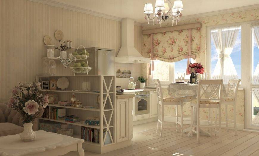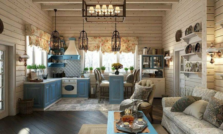 Кухня, совмещенная с гостиной, в стиле прованс.