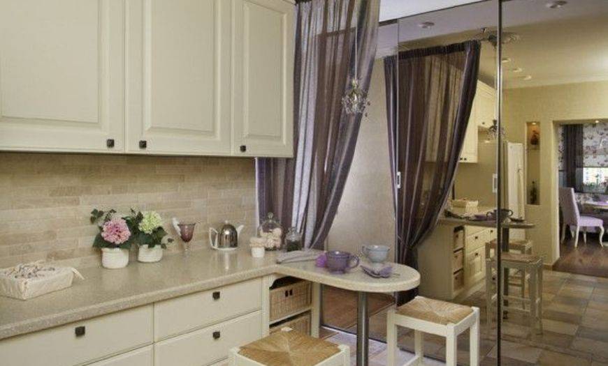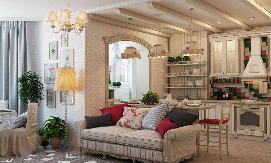 Объединение в одном помещении функций трех комнат — кухни, столовой и гостиной, может стать выгодным решением, повышающим комфорт жизни. Успешная реализация плана во многом зависит от конфигурации и объема помещения. Например, в комнате L-образной формы зонирование происходит естественным образом. Главным вопросом для организации кухни гостиной прованс становится грамотное выделение места под каждую зону. Для деления используют несколько приемов: