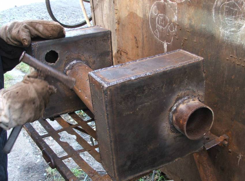 - В корпусе вырезают проемы, необходимые для подсоединения дымоходного патрубка и прочистного технологического лючка. Последний обрамляют и закрывают дверцей. Для крепления можно использовать болты.