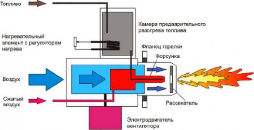 Работает такое изделие по следующему принципу. Масло или дизельное топливо подается в дозатор из внешнего топливного бачка. Дозатор здесь необходим для постоянной поддержки пламени. При горении топливо нагревает стальную чашу сгорания, которая способна отдавать тепло и обогревать помещение. В эту конструкцию можно дополнительно поставить вентилятор, который сможет ускорить обогрев помещения. Продукты сгорания выходят через дымоход, его длина должна быть не меньше 3-4 м.