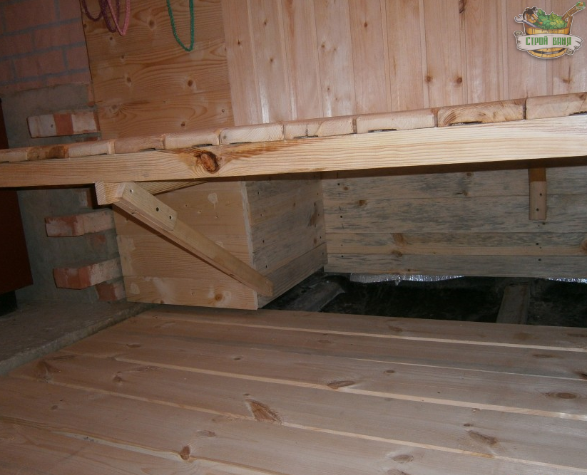 То есть, конструктивно это обычный деревянный пол. За исключением того, что надо делать сток. Его делают либо у противоположной от полка стены, либо как на рисунке выше, посередине.