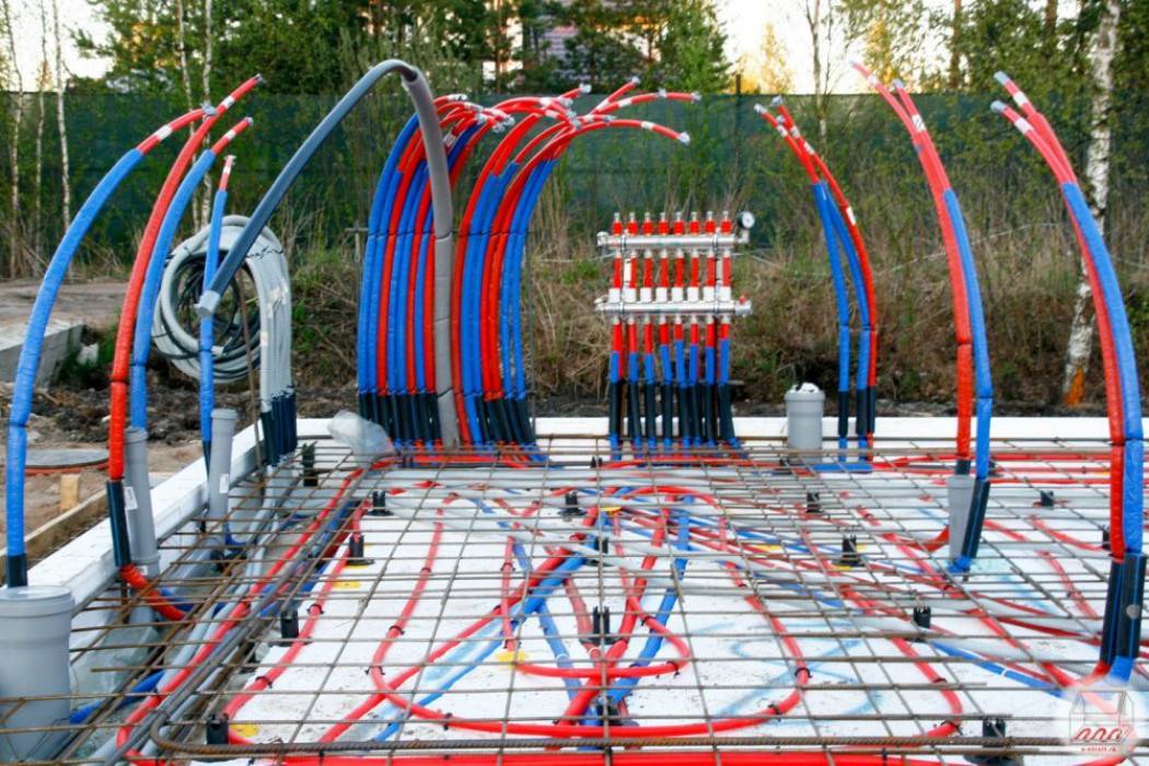 При монтаже труб теплого пола в бетонном монолите рекомендуется предварительно закачать в них сжатый воздух компрессором, чтобы исключить смятие от веса раствора. Укладывают трубы контура отепления с расстоянием между ними не менее 100 мм и не более 250 мм. Максимальная длина труб под домом не должна быть более 100 м.