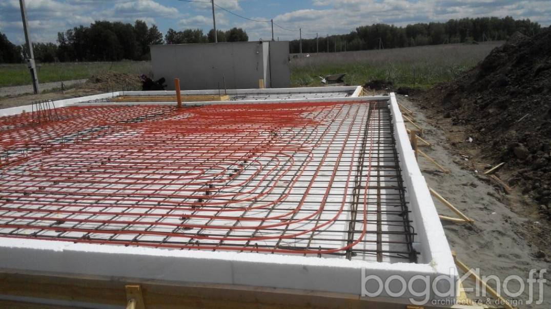 В конструкции фундаментной плиты имеется система обогрева пола, что позволяет защитить основание от промерзания и деформации, сократит утечку тепла и превратит основу дома в аккумулятор тепла. Даже в зимнее время, в момент отключения систем обогрева, фундамент долгое время отдает свое тепло помещению.