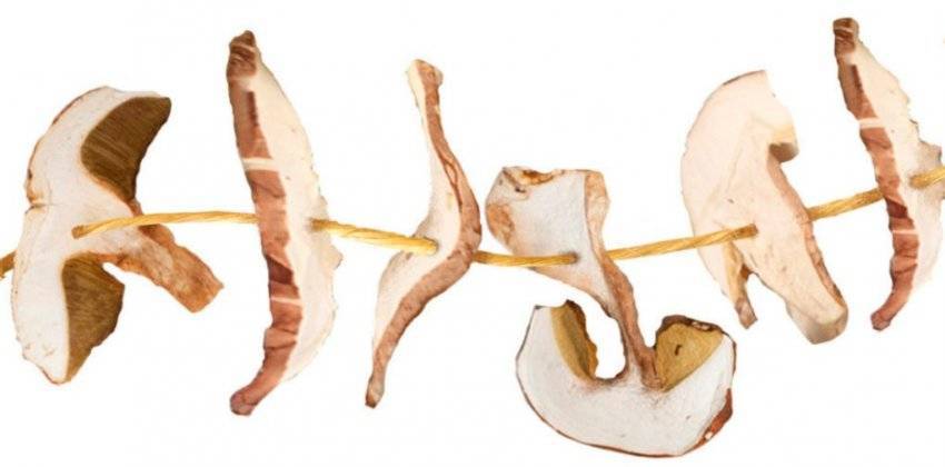 Лучше, чтобы грибные кусочки не соприкасались друг с другом, так они быстрее высохнут. Часто их так и хранят, нанизанными на нитке, однако это не совсем правильно, так как на продукте оседает пыль.