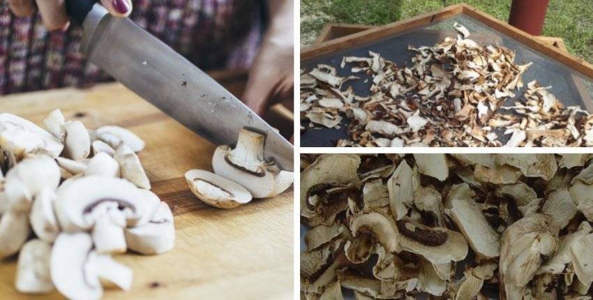 Засушить грибы естественным образом можно как в доме, так и на открытом воздухе. Для этого очищенные с помощью мягкой щётки и нарезанные шампиньоны раскладывают в один слой на ровной поверхности.