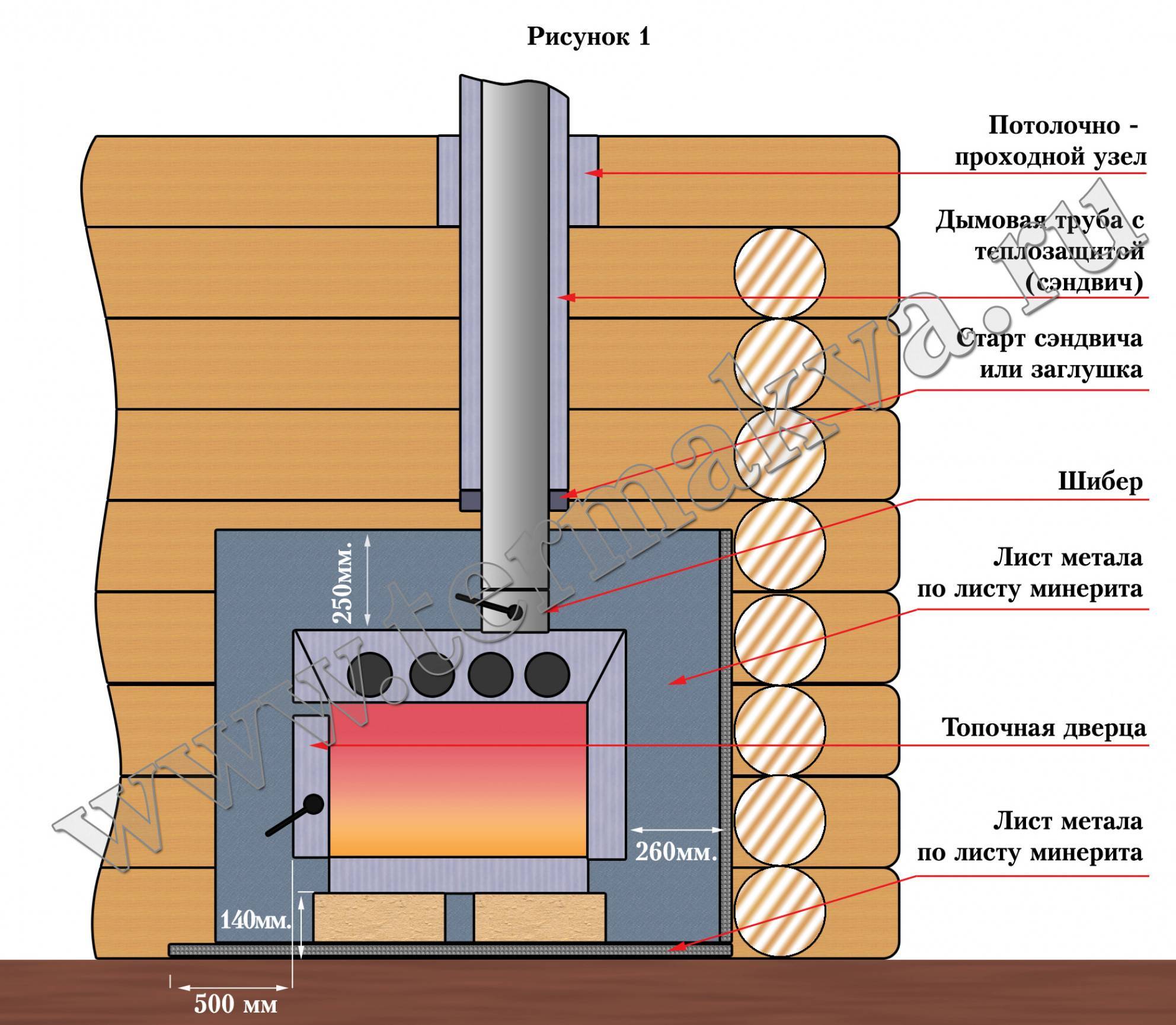 Установка уже сваренной печки из трубы в баню должна отвечать технике пожаробезопасности