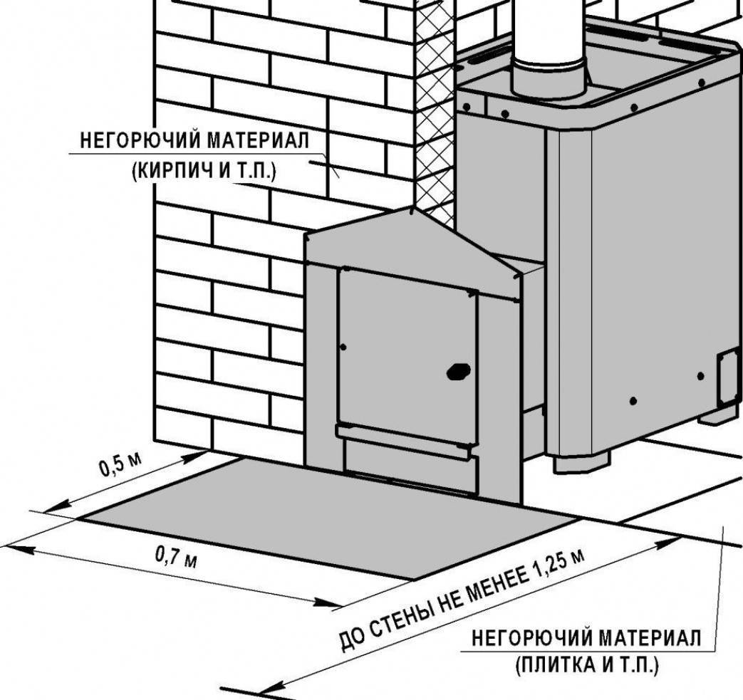Ставить лучше печку в углу, чтобы, поливая камни водой, никто не обжегся горячим паром. Обязательно нужно, чтобы расстояние от печи до полок соответствовало действующим нормам и правилам пожарной безопасности.