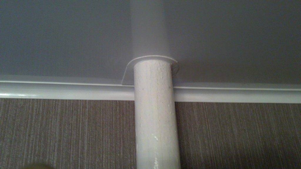 - Затем надеваем нашу, заранее изготовленную, пластинку снизу на стояк, разведя края разреза, наносим на нее сверху клей и прижимаем на десяток секунд к поверхности потолка. Обвод стояка выполнен.