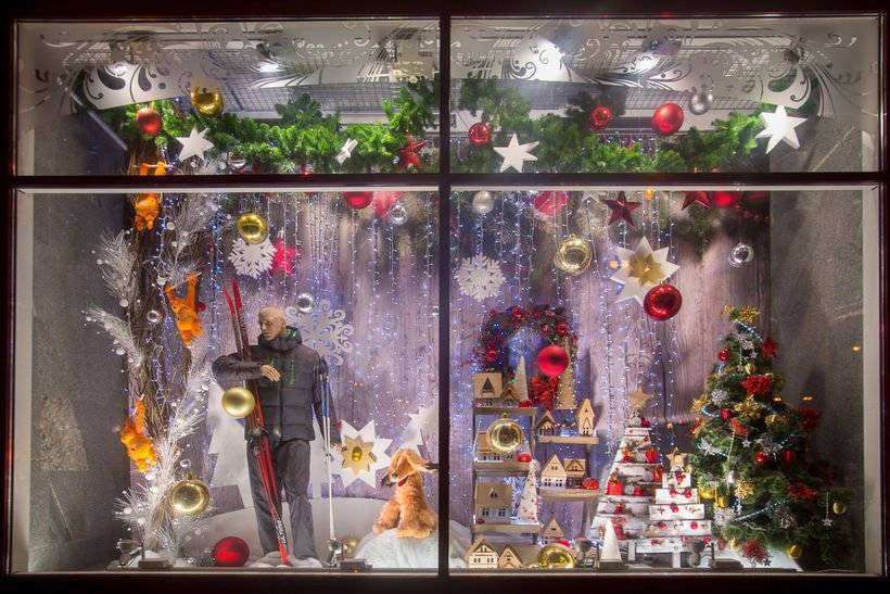 Собственники магазинов, кафе и ресторанов, салонов и прочих предприятий, связанных с обслуживанием клиентов, тщательно продумывают декор витрин и украшают их стильно и креативно. Чтобы выделиться среди конкурентов, а также подарить своим клиентам новогоднее настроение, они используют тематические цветные наклейки на стекла, декор из бумаги, новогодние атрибуты (это, конечно же, красавица-елка, новогодние снежинки, Дедушка Мороз), украшения в стили «хенд-мейд».