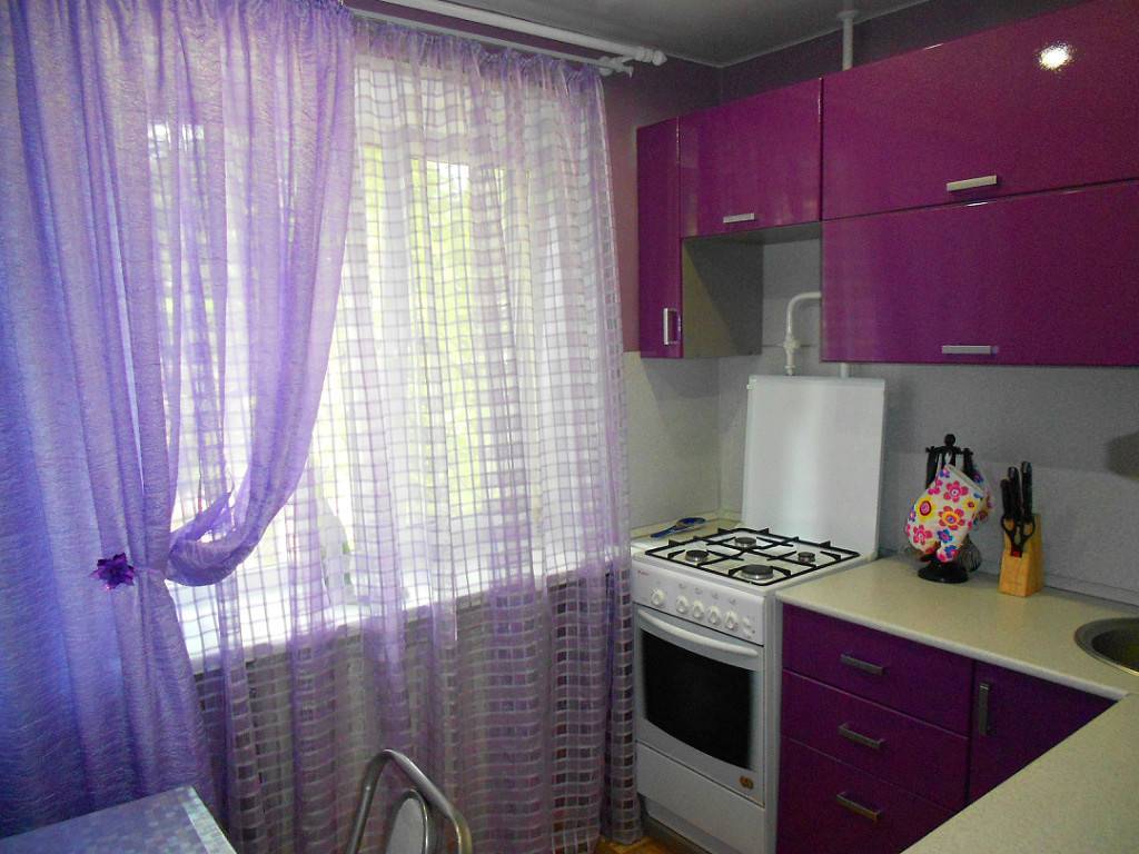 Для кухни лучше применять коротенькие шторы. К примеру шторы-кафе: они прячут лишь часть находящейся снизу окна. Если окна не упираются в соседские из дома наоборот, шторы имеют в основном декоративное значение. В этом варианте подходит короткая занавеска в форме арки. От рюшей, оборок, воланов лучше отказаться: они делают впечатление захламленности и хуже выстирываются. Можно навесить на окно римские шторы или жалюзи. Лучше всего, чтоб текстиль был легким и полупрозрачным: органза, лёгкий тюль, кисея.