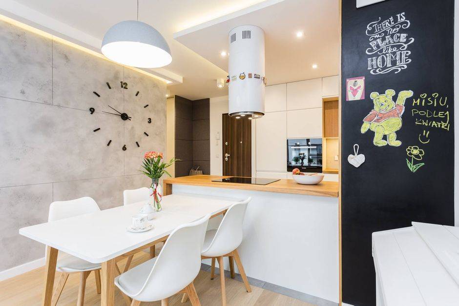 1. Современный интерьер кухни-студии — это смешение разных стилей и направлений. Отлично подойдут мягкий минимализм или скандинавский стиль с элементами других стилей — от легкой классики до хай-тека.