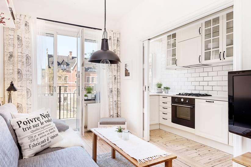 Для маленьких помещений как нельзя лучше подходит скандинавский стиль интерьера. Это вызвано тем, что светлые тона в сочетании с натуральными материалами (гранит, древесина и т.д.) делают помещение более просторным и уютным. Этот стиль прост, практичен, и в тоже время очень комфортен.