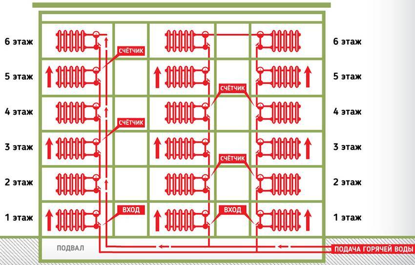 Многоэтажные дома могут иметь один из вариантов разводки системы отопления – вертикальный либо горизонтальный. Дома старого фонда, такие как хрущевки и сталинки, в основном характеризуются вертикальной системой отопления. В этом случае контур теплосети может быть одно- или двухтрубным. Однако прогон теплоносителей по межэтажным уровням имеет последовательность снизу вверх и сверху вниз. Главные минусы вертикальной разводки: