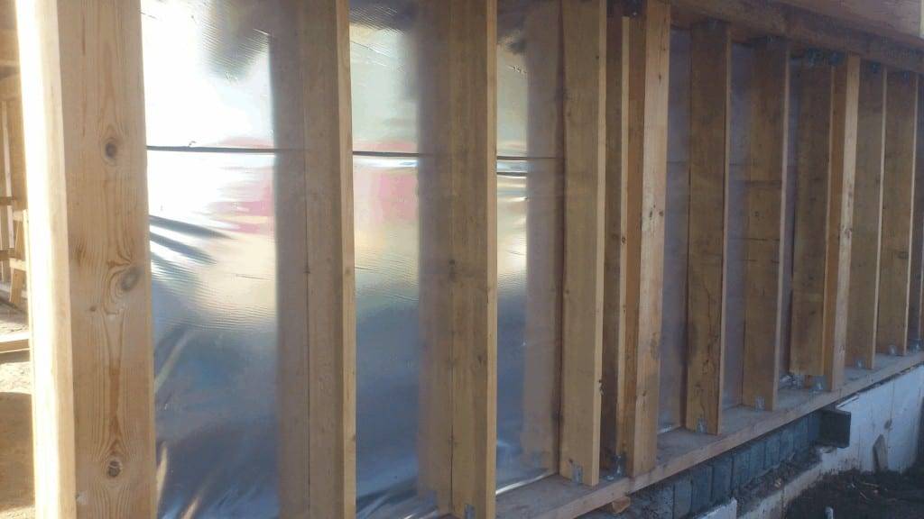 Гидроизоляционный материал (пергамин, полиэтиленовая пленка или мембранное покрытие) необходимо уложить на стены, зафиксировать гвоздями, проклеить стыки скотчем. Полосы накладывают внахлест (напуск в 10 см).